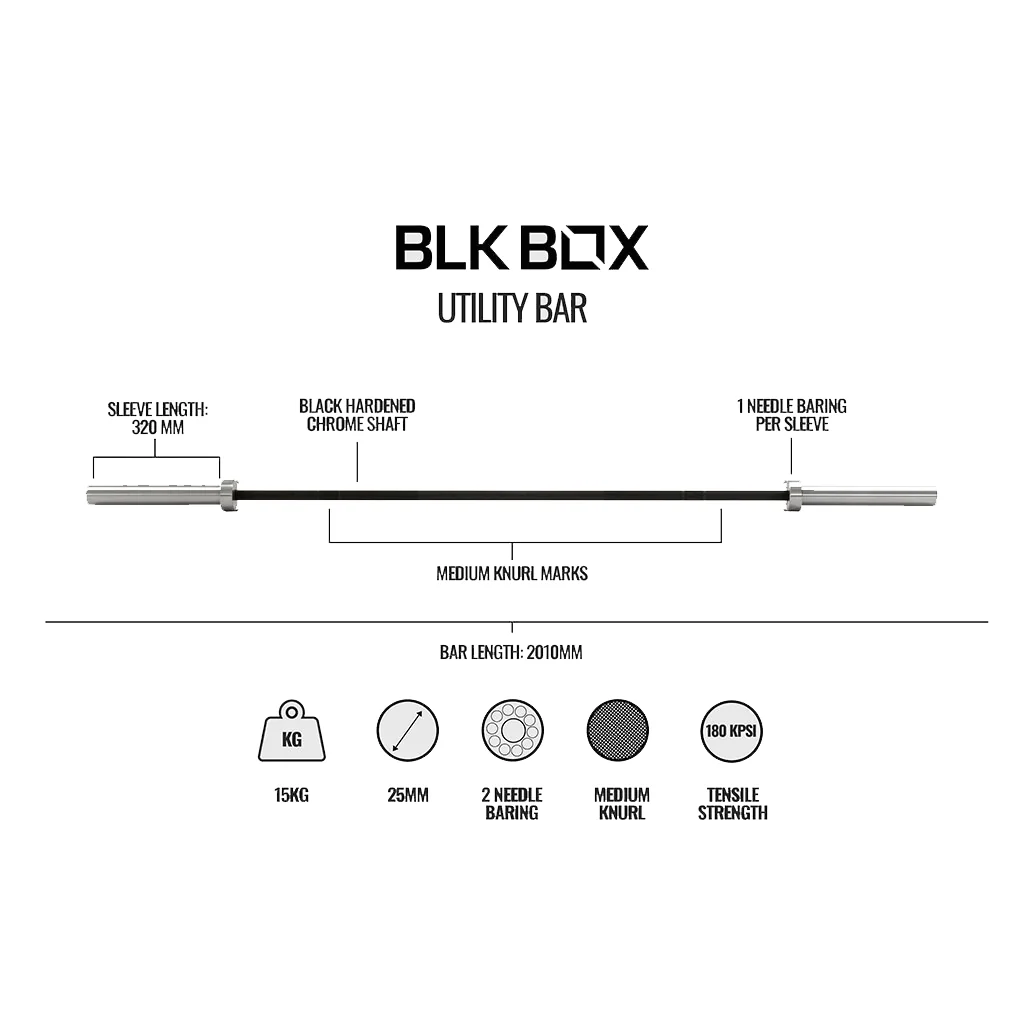 The BLK BOX Utility Bar is the ideal entry-level Olympic barbell for those looking to build strength and skill in weightlifting and powerlifting. Engineered for versatility, it features a 25mm shaft built to IWF standards, delivering a responsive whip and a smooth, reliable spin thanks to a combination of roller bearings and bronze bushings in each sleeve.Â